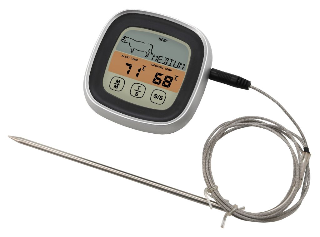 Praktický digitální teploměr pro grilování, s odepínatelnou nerezovou sondou a dotykovým displejem pro snadné používání. U přístroje lze nastavit jak druh masa, tak požadovaný stupeň propečení, nebo použít jako časovač. Ovládání je řešeno praktickým dotykovým displejem a vypínání spolu s přepínačem teploměru a časovače na zadní straně zařízení. O napájení se starají 2x AAA baterie (nejsou součástí balení). Zařízení je pak opatřeno magnetem pro snadné uchycení.