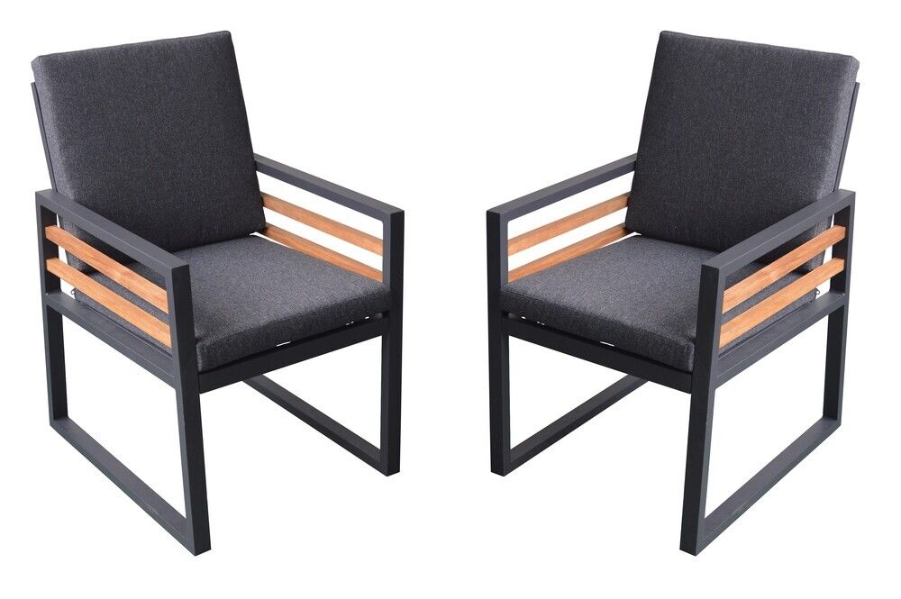 Luxusní hliníková křesla v grafitovém provedení, doplněna o dřevěné výplně z novozélandské borovice ošetřené pryskyřicí a voskovým olejem. Moderní křesla, která skvěle zapadnou do každého exteriéru či interiéru. Velmi pohodlné podušky z polyesteru (250g/m2) s molitanovou výplní (5 cm) jsou odolné UV záření. Všechny podušky jsou vybaveny zipy, díky kterým můžete polyesterový potah z vodoodpudivé předené tkaniny jednoduše sundat. Křesla mají díky použitým materiálům a modernímu vzhledu opravdu široké využití, je vhodná pro vnitřní i venkovní prostory – zahrady, terasy, zimní zahrady nebo třeba do uvítací haly či recepce. Díky jednoduché montáži, budete moci již po chvíli křesla naplno využít.
