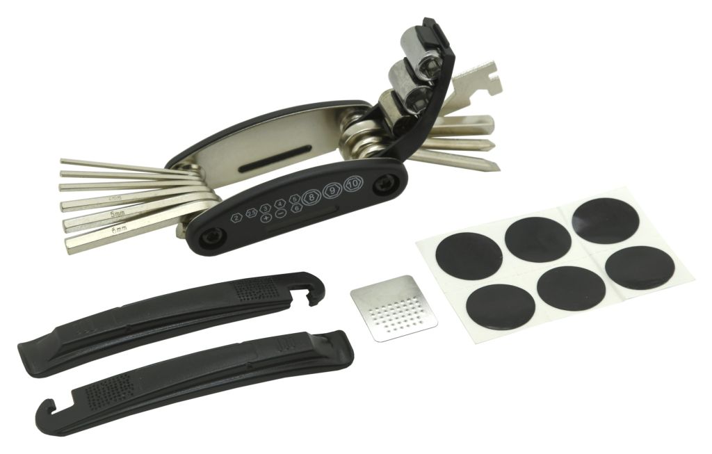 Praktická brašnička s multifunkčním nástrojem a samolepícími záplatami na duše, se snadným uchycením na jízdní kolo pomocí pásku se suchým zipem. Brašna byla vyrobena z odolného materiálu a je uzavíratelná na rozměrný suchý zip. Uvnitř skrývá prostor s multifunkčním nástrojem, montpákami pro snadnou demontáž pneumatik, plíškem pro zdrsnění a samolepících záplat na duše pneumatik. Multitool je složen z 6x imbusových klíčů (2/2,5/3/4/5/6 mm), křížového a plochého šroubováku, stranovým klíčem (8/10/15 mm a klíčem 14GE na výplet kol) a v neposlední řadě čtyřhranným šroubovákem spolu s HEX nástavci (8/9/10 mm).