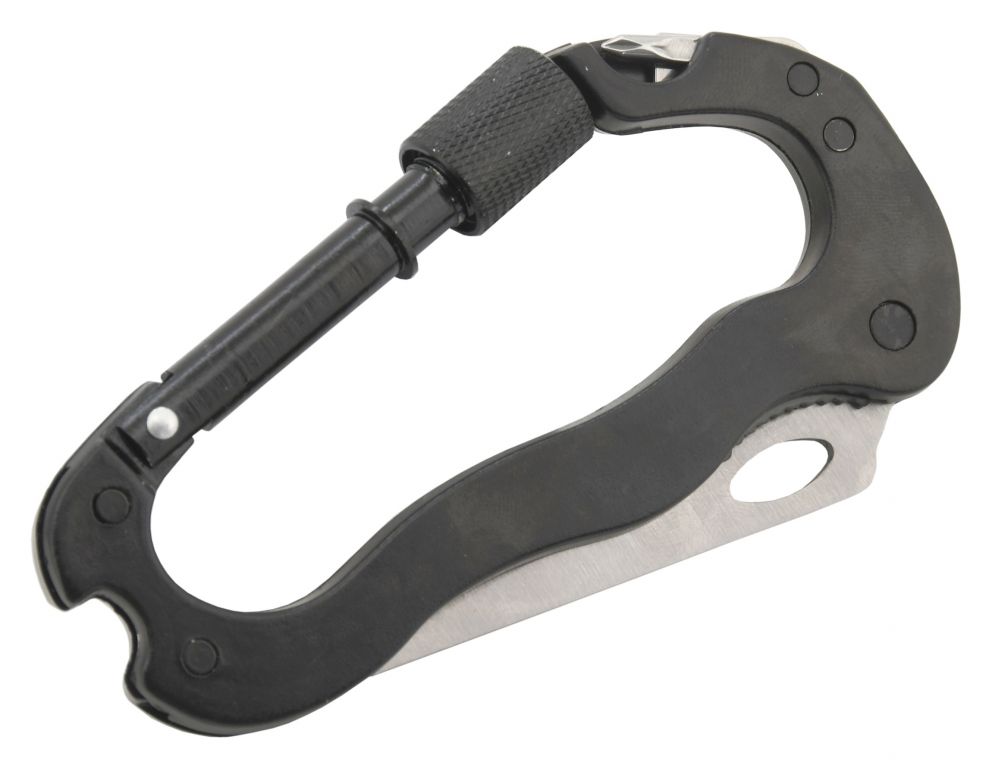Rozměry karabiny 116 x 66 mm zajistí bezpečné uchycení veškeré kempingové výbavy. Karabina je opatřena nožem délky 7,5 cm s pilkovou částí, nůž je opatřen pojistkou, takže nehrozí jeho nechtěnné složení. V horní části jsou potom k dispozici šroubovací nástavce křížový a plochý. Karabina je prakticky tvarována, zejména pro pohodlné použití nože.