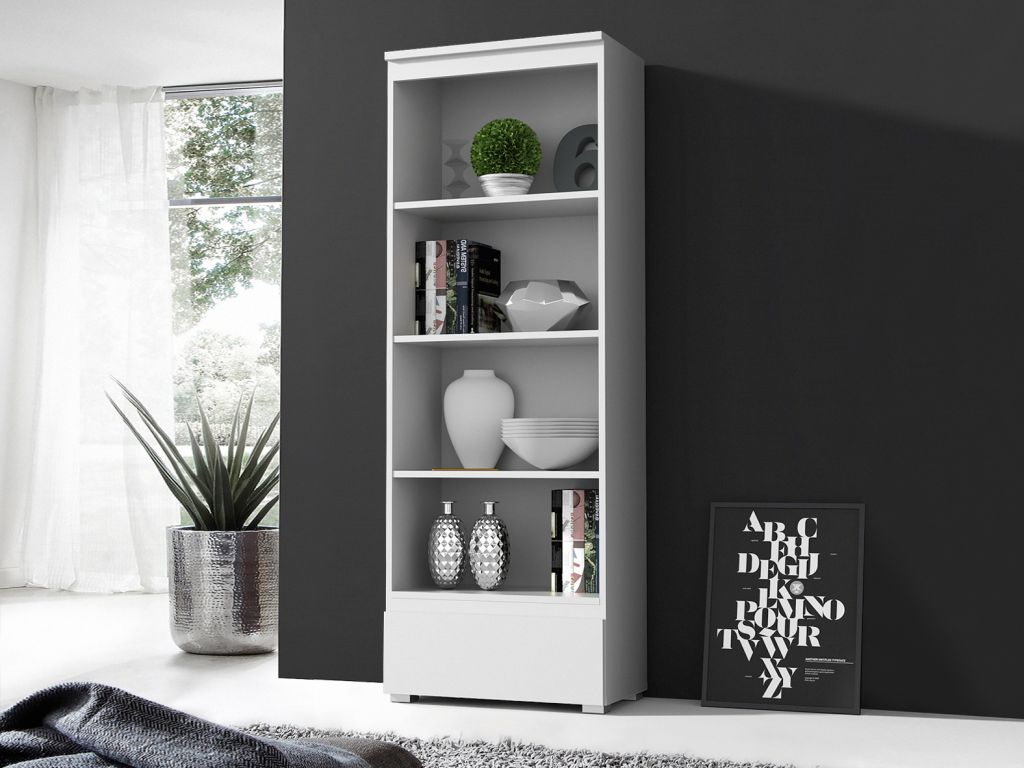 Otevřená police FlexiLine pro bílá sonoma room. Moderní prostorná policová skříň kombinuje minimalistický design s praktičností. Je vybavena čtyřmi otevřenými policemi na knihy, složky, dekorace nebo kancelářské doplňky a hlubokou výsuvnou zásuvkou na drobnosti a dokumenty.