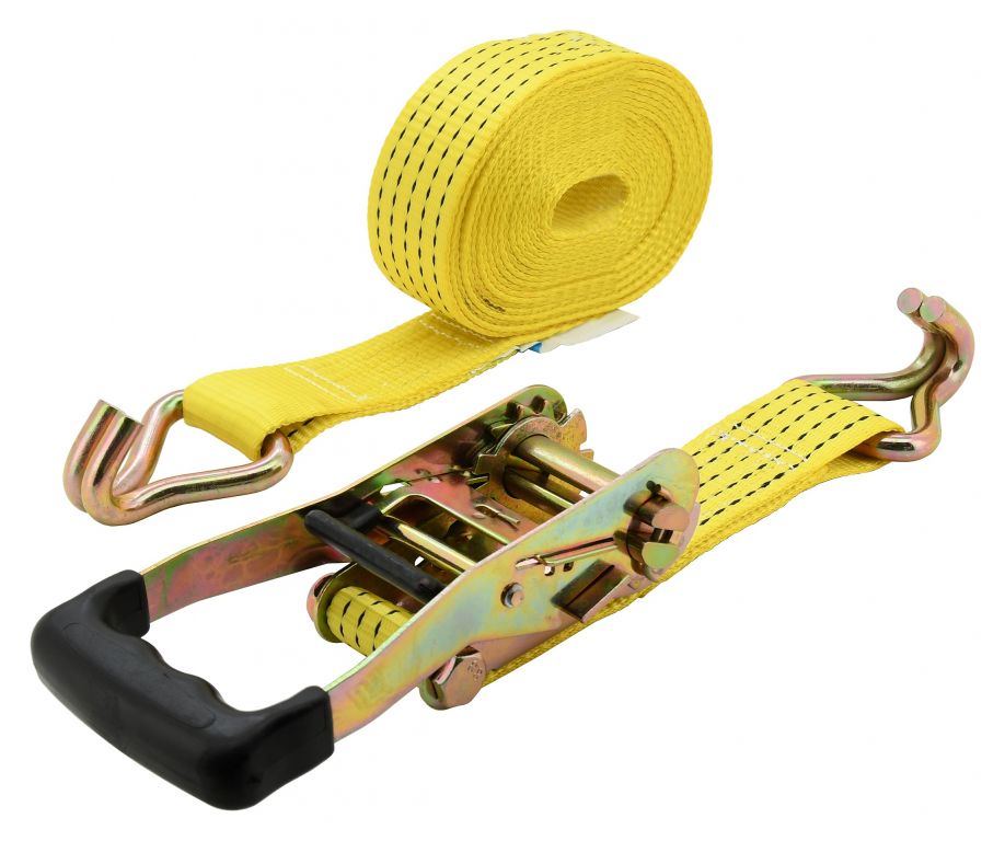 Ráčna je celokovového provedení s odolným jistícím mechanismem, opatřeným plastovým madlem pro pohodlnou manipulaci a ovládání. Popruh šíře 50 mm s délkou 6 m se vyznačuje pevností v tahu 5000 kg (po obepnutí nákladu). Při upínání nákladu doporučujeme používat plastové rohy nebo ochranné návleky. Bez použití ochranných návleků, nebo rohů, dochází ke snížení pevnosti upínacích pásů a k opotřebení popruhu. Upínací pásy není povinné evidovat, nemusí se provádět revize, ale doporučujeme je minimálně 1x ročně prohlídnout řádně proškolenou a přezkoušenou osobou.