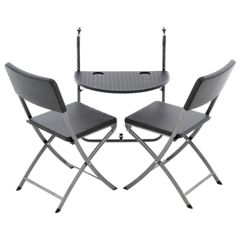 Židle se snadno skládají a stůl se snadno a jednoduše sklopí. Ať už na balkoně nebo na terase: díky různým možnostem nastavení lze sadu použít na jakémkoli zábradlí nebo parapet. Ať už jako konferenční stolek nebo jako úložný prostor, na snídani nebo po práci. Balkonový nábytek je použitelný ve všech funkcích. Polyratan se velmi snadno udržuje a snadno se čistí. Balkonový nábytek můžete nechat venku bez ohledu na počasí. Deska stolu z tvrdého plastu je výškově nastavitelná do 3 pozic a závisí na výšce vašeho zábradlí. Balkónový stůl je navíc vybaven dvěma výklenky, které slouží jako držáky nápojů. Balkónový nábytek je robustní, stabilní a snadno se o něj stará. Pokud nábytek není potřeba, lze jej okamžitě složit a uložit, aby se ušetřilo místo.