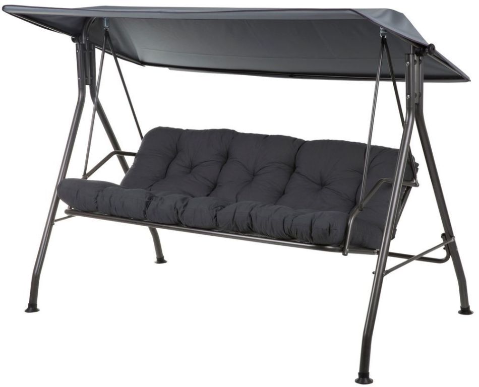 Houpačka pro 3 osoby. Solidní, pevná konstrukce. Rám malovaný práškovou polyesterovo-epoxidovou antracitovou barvou. Stříška vyrobena z polyesteru s lehkým vodoodpudivým nátěrem, má speciální tunely přizpůsobené ke střešní konstrukci houpačky. V sadě také 2 prošívané sedáky z bavlny. V opěrné části šňůrky pro připevnění k rámu.