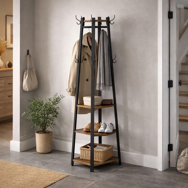 Pevná ocelová konstrukce v kombinaci s kvalitní dřevotřískou zaručuje dlouhou životnost a stabilitu. Tři praktické police unesou až 10 kg každá, osm háčků pojme kabáty i klíče a spodní háčky jsou ideální pro děti. Díky kompaktním rozměrům 43 × 43 × 180 cm se stojan snadno vejde i do menší předsíně.