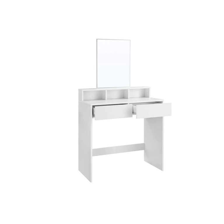 Začněte svůj den s úsměvem a pohodlím u moderního toaletního stolku VASAGLE. Prostorné zásuvky a otevřené přihrádky vám umožní mít make-up, parfémy i doplňky vždy na dosah ruky. Velké obdélníkové zrcadlo a elegantní bílý design dodají vaší ložnici svěží a upravený vzhled.