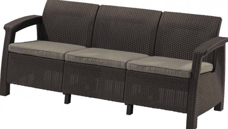 Moderní sofa pro 3 osoby z lisovaného plastu v imitaci plochého umělého ratanu – hnědá barva + šedo – hnědé podušky. Vhodné posezení pro venkovní i domácí účely (zahradu, terasy, do altánu, zimní zahrady, domácnosti, do restaurace..) Snadná údržba.